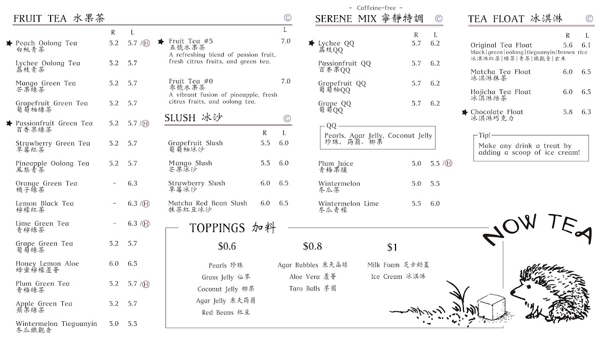 Now Tea’s menu is a delightful exploration of flavors, showcasing a variety of tantalizing beverages. For those who crave something refreshing yet creamy, the Black Tea Float and Matcha Tea Float are popular choices, combining rich tea flavors with creamy ice cream. If you're looking for something fruity and caffeine-free, the Grapefruit QQ and Lychee QQ blends are bursting with freshness, featuring juicy fruits paired with delightful textures from brown sugar tapioca, coconut jelly, and agar jelly. The flavors are perfectly balanced, ensuring that each sip is a unique celebration of taste.